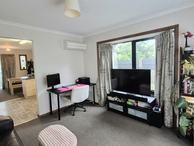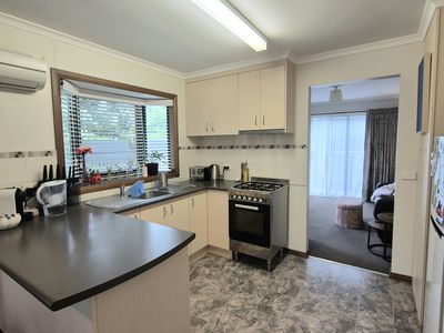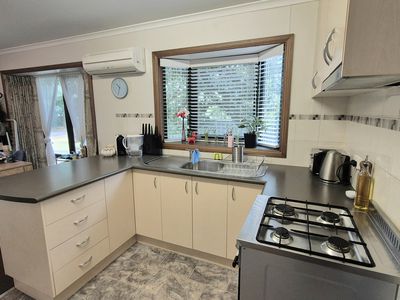The unit provides, A functional kitchen with great bench space, a dining area and a cozy lounge, with heating/ cooling supplied via a split system.